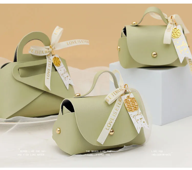 This solid colour PU leather wedding gift wrapping bag is available in Chinese Red (Medium), Pink (Large), Hibiscus Purple (Small) and Malachite Green (Medium). Premium PU leather material for a luxurious gifting presentation.